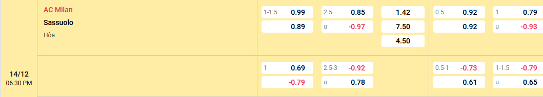 AC Milan được nhà cái đánh giá cao hơn Sassuolo khá nhiều và nó được thể hiện qua mức kèo chấp 1 1/4 trái. Đây là tỷ lệ kèo nên đặt niềm tin vào đội khách bởi họ thắng kèo tới 4, hoà kèo 1 và thua kèo có 1 lần sau 6 trận xa nhà. Điều quan trọng nhất là Sassuolo thắng kèo tới 4, hoà kèo trong 6 lần làm khách trên sân của AC Milan và có 2 trận được chấp kèo 1 1/4 trái như ngày hôm nay.