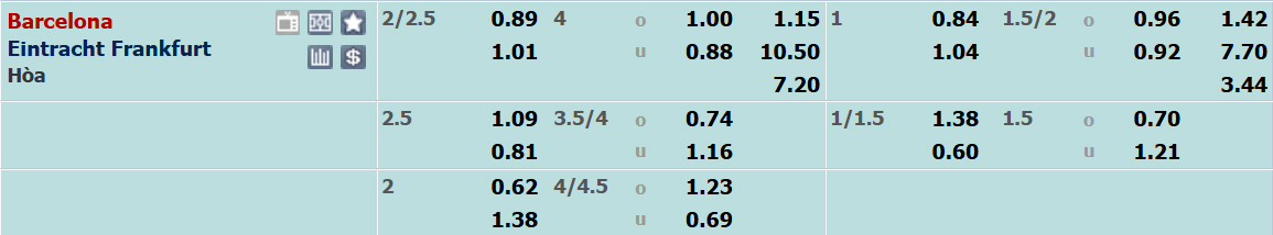 Kèo tài/xỉu: Tài - Barcelona đã ghi 12 bàn qua 5 trận đấu ở cúp C1 châu Âu mùa này. Trong khi đó, Frankfurt đã phải vào lưới nhặt bóng tới 14 lần. Do đó, Barcelona hoàn toàn có thể tạo nên cơn mưa bàn thắng.