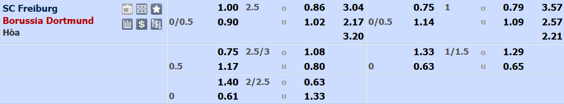 Trên sàn giao dịch, Dortmund được xếp ở cửa trên với tỉ lệ 1/4:0. Kèo chấp không quá chênh lệch nhưng thầy trò Niko Kovac vẫn đáng tin bởi ngoài phong độ tốt, họ đã thắng trong cả 7 màn chạm trán Freiburg gần đây ở Bundesliga.