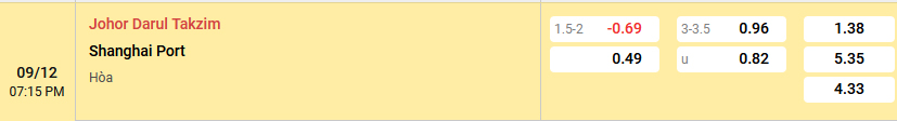Nhà cái đang niêm yết mức kèo 0:1 1/4 và nó chứng tỏ Johor được đánh giá cao hơn Shanghai Port. Đây là tỷ lệ kèo vẫn nên đặt niềm tin vào đại diện của Malaysia bởi họ thắng tới 14/16 trận trên sân nhà với tỷ số cách biệt từ 2 bàn trở lên. Trong khi đó, Shanghai Port thua kèo 4/5 trận đã thi đấu tại sân chơi Cup C1 châu Á và đều với tỷ số cách biệt.