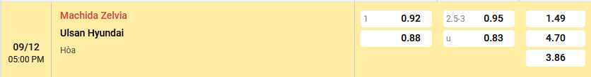 Nhà cái đang niêm yết mức kèo 0:1 và nó cho thấy sự chênh lệch về đẳng cấp giữa 2 đội. Đây là tỷ lệ kèo vẫn nên đặt niềm tin vào đội chủ nhà Machida Zelvia bởi phong độ ổn định trên sân nhà khi thắng kèo tới 8/12 trận vừa qua. Trong khi đó, Ulsan thi đấu không tốt trên sân khách khi thua kèo tới 13/15 trận đã thi đấu