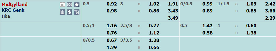 Kèo tài/xỉu: Tài - Midtjylland đang thể hiện lối chơi khá cởi mở nên cả 4 trận gần đây của đội bóng này đều khép lại với ít nhất 3 lần lưới rung. Bên kia chiến tuyến, 4/6 trận xa nhà gần đây của Genk cũng có kết quả tương tự.