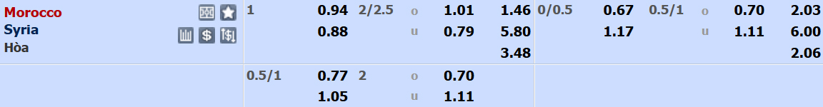 Morocco được xếp ở cửa trên với tỉ lệ 0:1 nhưng không đáng tin tưởng bởi đội bóng này đã để thua kèo châu Á ở 5/7 trận gần nhất trên mọi đấu trường. Trong khi đó, Syria đã bất bại liên tiếp 8 trận gần đây, trong đó có 6 trận vượt kèo handicap.