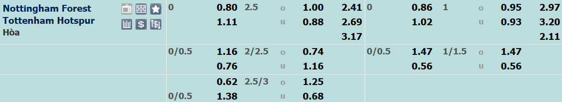 Màn so tài này được đánh giá cân bằng với kèo hòa được thua (0:0). Giới đầu tư châu Á có thể tin tưởng Nottingham bởi đội bóng này đã thắng 5/7 trận gần nhất trên mọi đấu trường theo cả tỉ số chuyên môn lẫn tỉ lệ châu Á. Trong khi đó, Tottenham chỉ thắng 1/6 vòng đấu gần nhất.