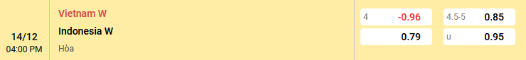 Nhà cái đang niêm yết mức kèo 0:4 và nó cho thấy sự chênh lệch về đẳng cấp giữa 2 đội. Với tỷ lệ kèo này, người chơi châu Á vẫn nên đặt niềm tin vào nữ Việt Nam bởi họ toàn thắng cả 7 lần so tài gần nhất giữa 2 đội và đều có tỷ số từ 4 bàn trở lên và có tới 6 trận có trên 5 bàn.