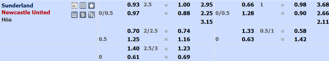 Newcastle được xếp ở cửa trên với tỉ lệ 1/4:0 nhưng không đáng tin bởi họ chỉ thắng 1/7 trận sân khách ở Ngoại hạng Anh mùa này. Ngược lại, Sunderland đã bất bại cả 7 trận sân nhà, trong đó có 6 trận thắng kèo châu Á.