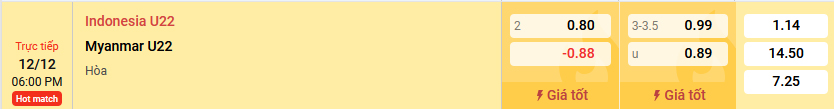 Nhà cái đang niêm yết mức kèo 0:2 và nó cho thấy U22 Indonesia được đánh giá cao hơn U22 Myanmar. Đây là điều không ngạc nhiên bởi đội bóng xứ vạn đảo cần một chiến thắng với cách biệt từ 2 bàn trở lên để nuôi hy vọng giành vé đi tiếp. Cần biết rằng, họ từng vùi dập U22 Myanmar với tỷ số năm bàn không gỡ tại kỳ Sea Games gần nhất.