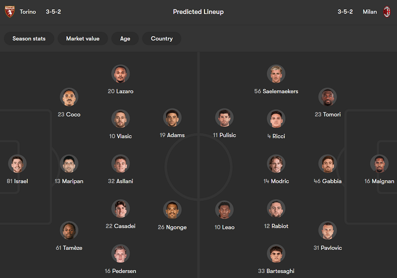 - Torino: Perr Schuurs, Giovanni Simeone và Zanos Savva chưa bình phục chấn thương; Ardian Ismajli bỏ ngỏ khả năng ra sân.